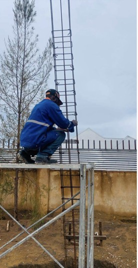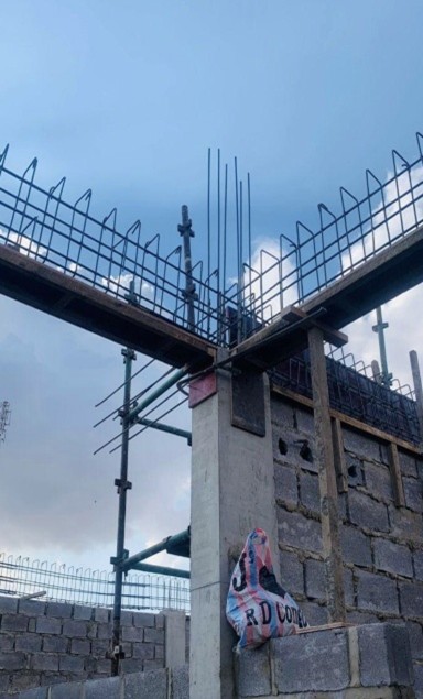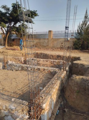 Comme le sol de la parcelle est sablonneux et instable, il a fallu prévoir des fondations renforcées en béton armé au lieu d’une simple maçonnerie de moellons souvent utilisée localement. Les équipes travaillent en deux postes, jour et nuit, afin de réduire les délais de livraison des deux bâtiments.